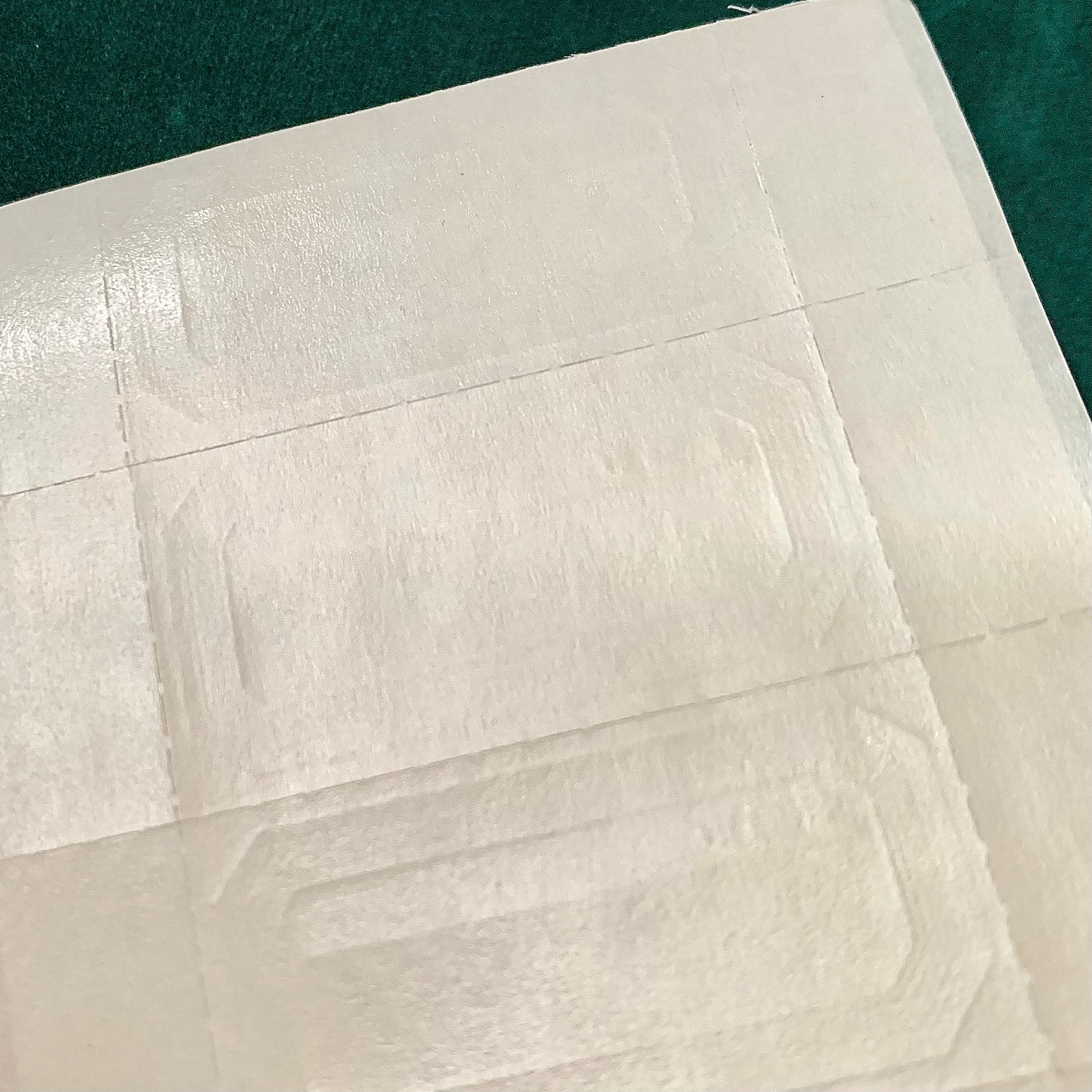 水のりは切手のように裏に水をつけて貼ります。通常タイプだと台紙付が邪魔をしてここまで凹凸が出ません。